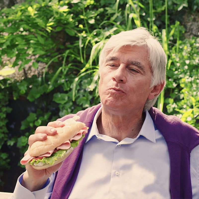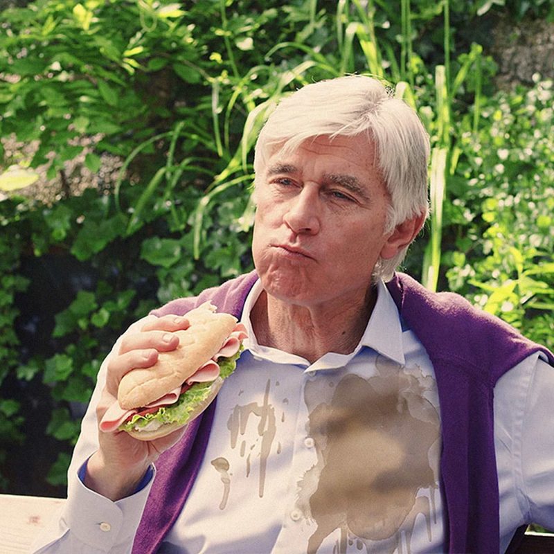Coffee stain on the shirt from this scene didn’t match the one from previous, where the actor bumps into a glass door and spills it over a much larger area. The smaller stain had to be removed, recreated and tracked onto the shirt for a final composite.